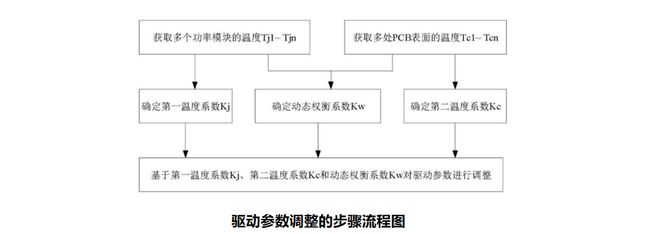 具体方案是通过“温度检测→系数计算→参数调整”的闭环逻辑,实现温度自适应控制。通过电连接或通信方式,获取第一温度(功率模块发热区温度,由第一温度传感器检测)和第二温度(基板第二表面温度,由第二温度传感器检测)。通过双温度传感器捕捉核心热源与表面温度,结合静态温度系数与动态热冲击系数,多维度调整驱动参数,从源头抑制过热。具体的温度系数怎么计算、温度信号采集方式以及动态权衡和驱动参数调整就不一一列举了。
